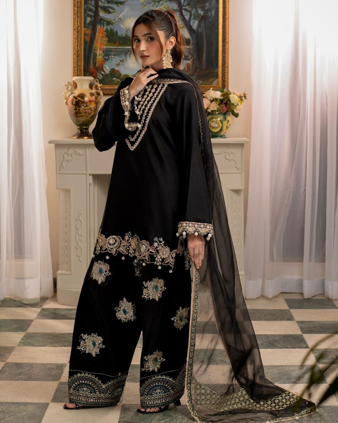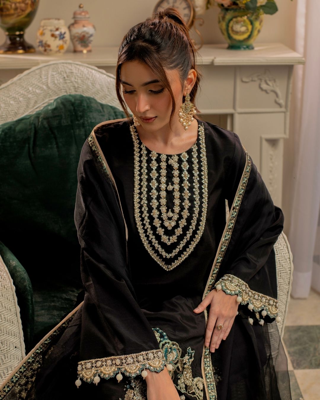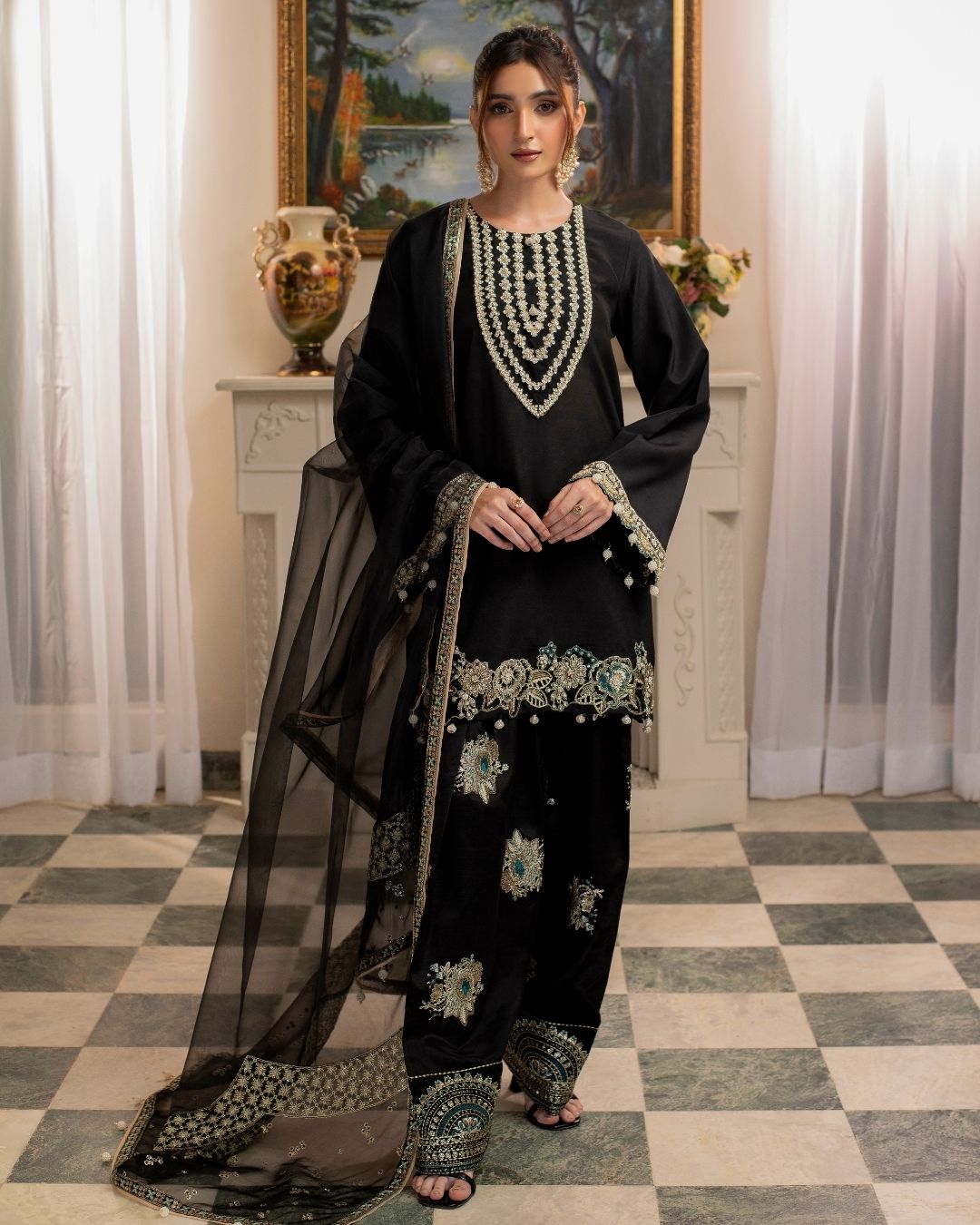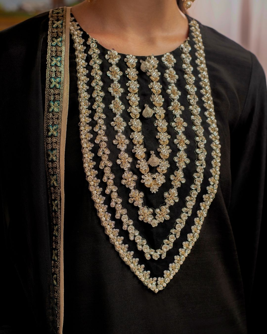 This chic 3-piece set features a modern short shirt tailored in luxurious Raw Silk. The shirt shines with a fully embellished Multihead Gala and a statement Multihead and Embellishment Daman patti. The raw silk sleeves are detailed with a sequin and embellishment work patti. It is perfectly paired with raw silk trousers featuring decorative embroidery boti and a final embroidery border. A magnificent Organza dupatta, covered in full multihead and sequins work, completes this dazzling look.