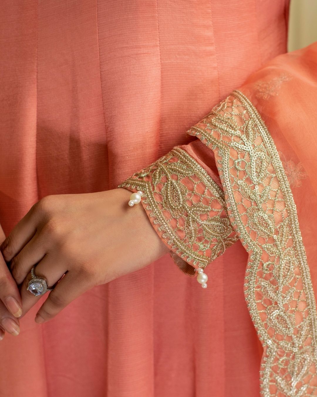 This stunning 3-piece ensemble is crafted from rich Raw Silk and delicate Organza. The long shirt features a heavily embellished Multihead Gala neckline. The daman is accented with a layered border of multicolor embroidery and embellishments, while the raw silk sleeves have multihead boti and a bold multihead patti. It's paired with comfortable raw silk trousers and a magnificent Organza dupatta that is fully embroidered.
